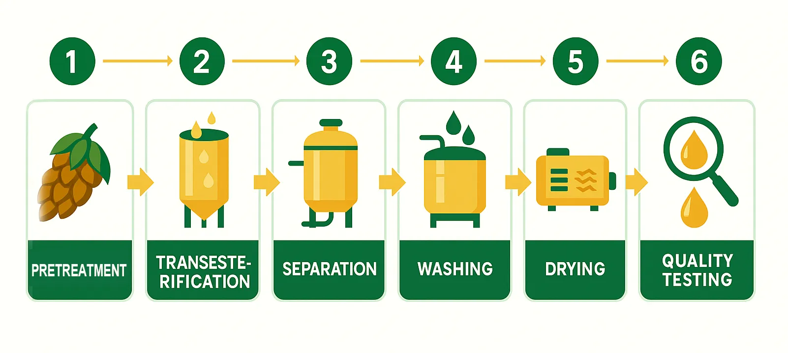 إنتاج الديزل الحيوي من زيت النخيل لا يتعلق فقط باتباع وصفة—بل يتعلق بالتحكم في كل متغير لتحقيق جودة متسقة. من التسخين الأول في المعالجة المسبقة إلى اختبار الجودة النهائي قبل الشحن، كل خطوة تؤثر مباشرة على الإنتاجية والتكلفة وقبول السوق.