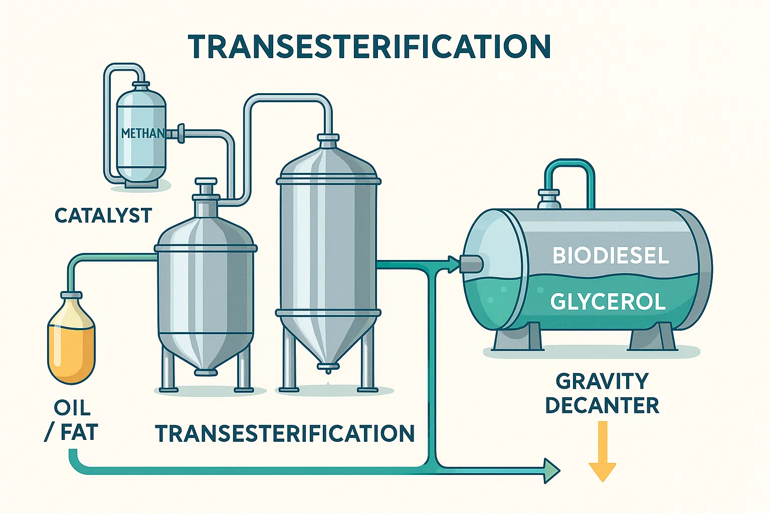 عملياً، نحافظ على درجة الحرارة حول 55–65°C، ونضمن نسبة مولية للميثانول إلى الزيت حوالي 6:1، ونحافظ على محتوى الماء عند أدنى حد. هذه المعلمات غير قابلة للتفاوض إذا كنت تريد ديزل حيوي متوافق مع المواصفات وبجودة ثابتة.