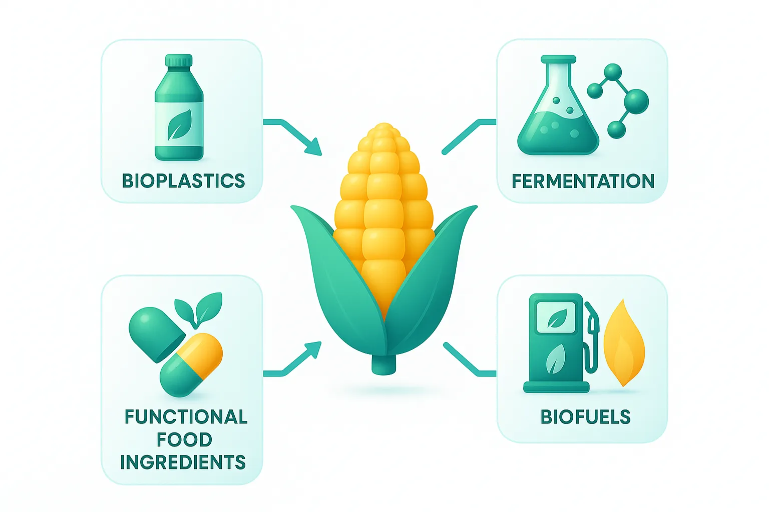 ترفع الابتكارات في إنتاج البوليمرات الحيوية، ومكونات الأغذية الوظيفية، والطاقة الحيوية من قيمة المنتجات الثانوية للذرة، مما يجعلها منافسة للمواد التقليدية القائمة على البتروكيماويات.
